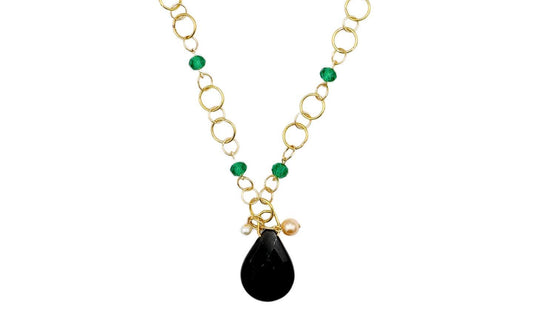 Stunning Women’s Faceted Emerald Green Glass Beads with Onyx Black Glass Tear Drop Pendant 18k Gold Plated Necklace