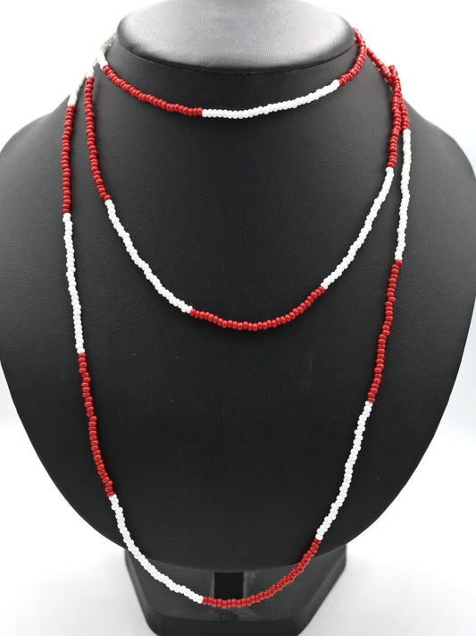 Beautiful Women's 61" Long Red and Pearlescent White Alternating Boho Southern Style Necklace SEC Inspired Team Spirit Czech Glass Beads